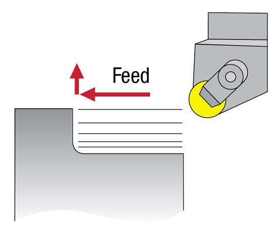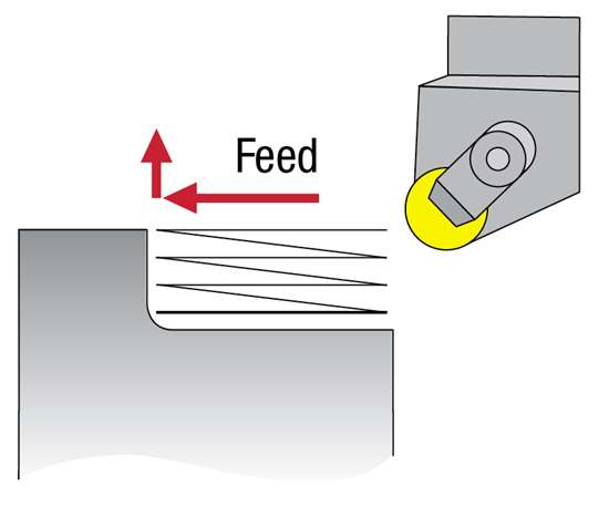 Recommendations for other insert shapes differ. For instance, a deeper cut may be advised for rough turning with a triangle or diamond insert. Whatever the specifics of the application, programmers should make sure to vary the cutting depth with each pass. The resulting change in the location of wear on the insert reduces the chance of notching and premature tool failure. Ramping cuts in the same direction provide the same effect.