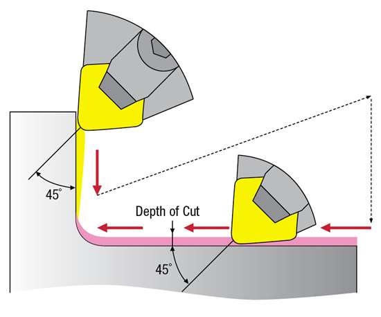 With ceramic tools, corners might require more of a programmer’s attention than carbide. In a case like this, NTK recommends roughing away as much material as possible, then engaging no deeper than the the 45-degree mark of the finishing insert’s corner radius. This approach minimizes notching and enables cutting in both directions with the same insert.
