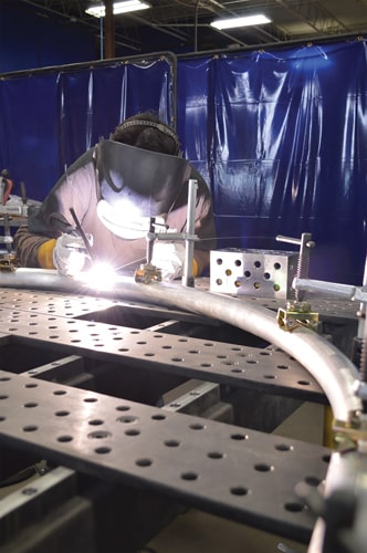 ATF’s welders used to weld angle and other various leftover lengths of steel to a worktable to create each weld fixture from scratch. It worked, but it was cumbersome and time-consuming. A modular worktable with a variety of blocks, pins, spacers, and clamps has been a tremendous help in simplifying and speeding up the fixturing process.