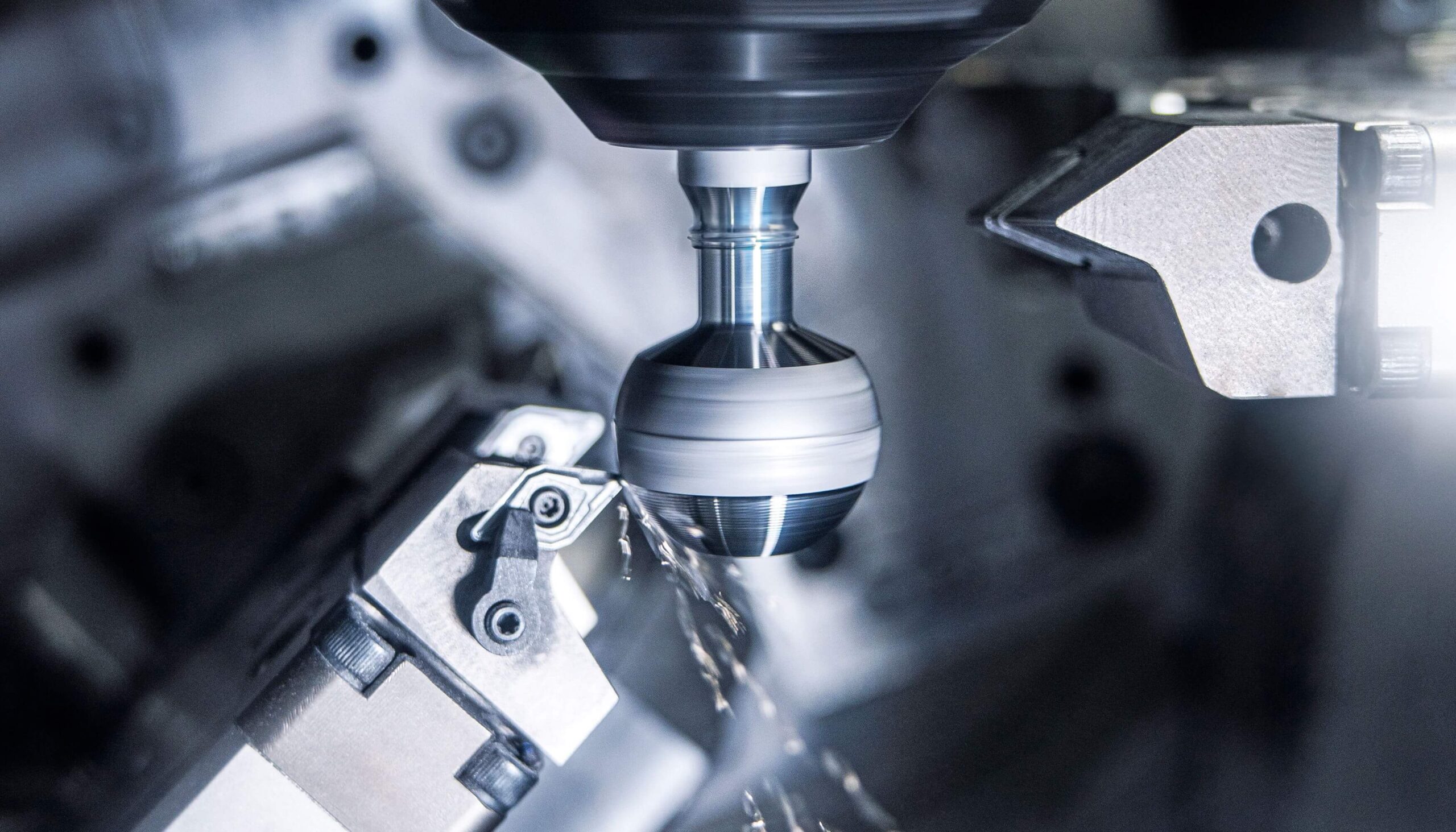The result has now been available for some time and a simple look at this machine makes it clear: the designers have done a particularly good job here. On the one hand, the VST 50 has highly automated processes, including the use of three robots. On the other hand, it is easy to operate using the EDNA apps, which also include various measurements and the robots. For the actual turning of the ball and neck of the ball pin (only these areas are involved here), there are two suspended workpiece spindles that can be moved irrespective of each other. As a result, one spindle is always loaded and unloaded while the other is in use during the machining process. The associated tool compound slides are split in two: the tools on the left-hand side are mounted on a rotary B-axis, which enables the ball to be turned and smoothed with precision. In addition, the ball diameter and shape can be adjusted using a linear U-axis. Special tools for neck machining are mounted on the right-hand side.