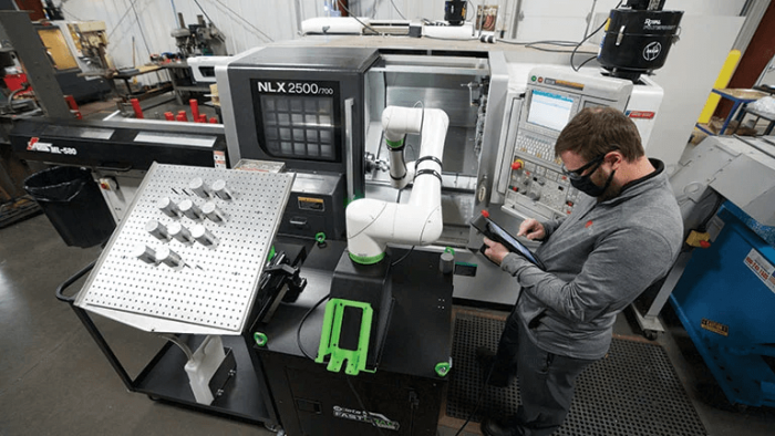 Additionally, shops are awakening to how cobots can boost the bottom line. “Shops are taking a different look” at the weekdays-only schedule “and finding the manufacturing team is open to more flexibility.” One UR customer created a weekend shift and found that many team members embraced the new opportunity. In other instances, shops that previously featured one skilled operator who performed machine setup and loading have added cobots for the loading function while the operator oversees multiple machines.