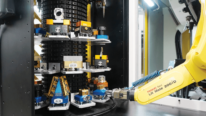 An LR Mate robot taking workholding from the carousel to be loaded into the RoboDrill.