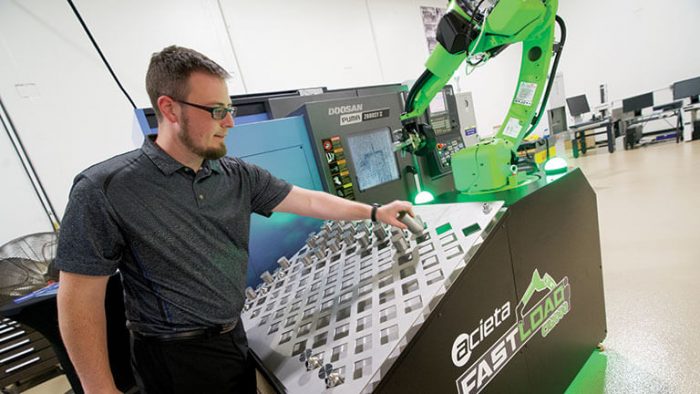 “We need more good machinists,” asserted John Lucier, FANUC automation manager for Methods. “That’s what robots help us with. Robots help shops get more jobs so they can put more machinists to work.” A well-trained machinist is not loading and unloading machines, “he’s setting them up, picking tools and writing programs.”