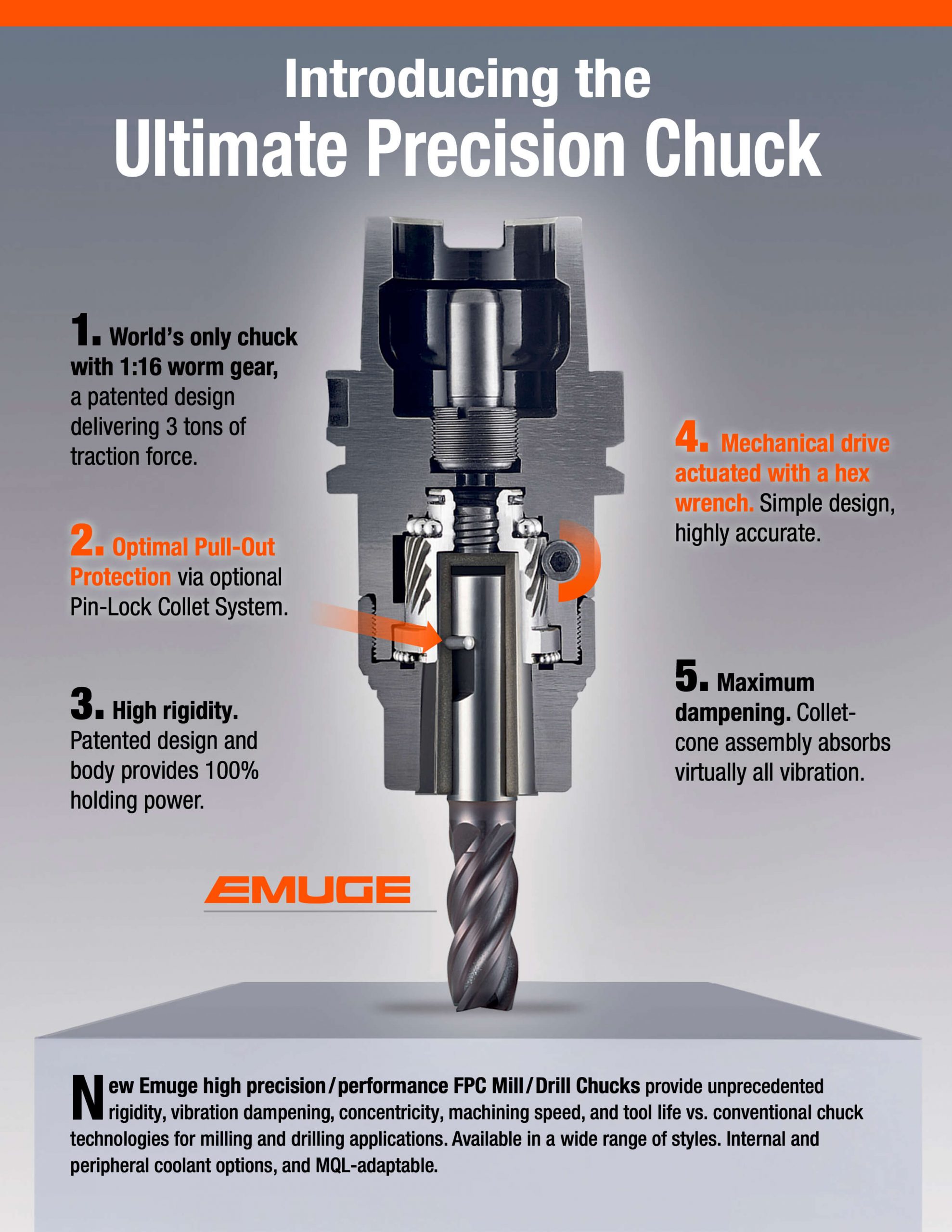 Featuring the world’s only chuck with a 1:16 worm gear, Emuge FPC Chuck’s patented design delivers three tons of traction force.