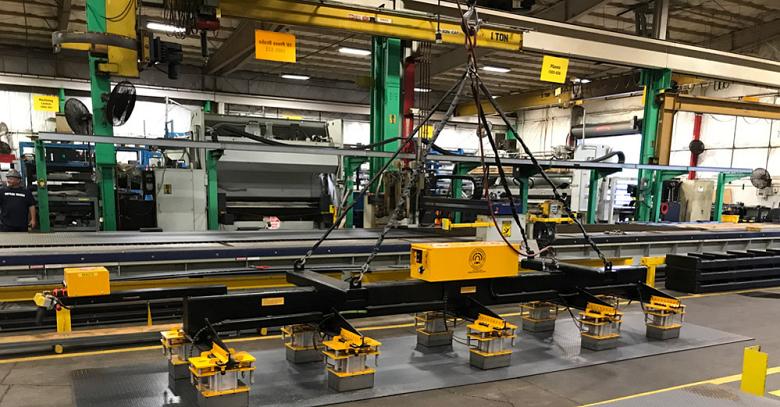 A magnetic lifter removes a cut deck plate from the plasma cutting table.