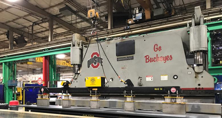 Employees used a combination of vacuum lifters and manual techniques to move sheets and plates through cutting and bending. This included a 100-ft. plasma table and a 600-ton press brake used to form the U-shaped ribs. Vacuum lifters work well in a variety of manufacturing environments, of course, particularly those that involve nonmagnetic material. But Mettler’s vacuum hoists needed to lift heavy loads. It took more than 30 seconds for suction pressure to build, and the suction pads had to be replaced frequently.