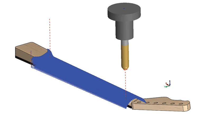 Previously, it would take him a full day to carve a body or neck. “With CAMWorks, I hit ‘start’ and go do something else. With the CAMWorks tooling program and my CNC router, I can complete a fretboard—fully shaped, slotted, and routed for a custom inlay—in about 30 minutes,” Miller noted. “CAMWorks virtual toolpaths allow me to evaluate my machining files before they are used in the shop. With the level of automation we’ve realized with CAMWorks software, we are saving a bunch of time—a 90 percent reduction in labor time and an 80 percent reduction in time overall—and money, which allows me to focus on the design features that make each guitar unique, such as custom inlays, custom finishes, and customer-centric modifications.”