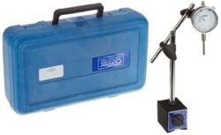 This Fowler dial indicator set has a 0 to1″ measuring range and is designed to measure variations within thousandths of an inch (0.001″). This set includes a dial indicator, magnetic base and fitted storage box. The magnetic base has an 85lb pull and the ability to mount indicators with a 1/4″ post.