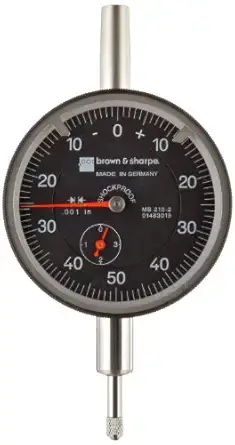 The Brown & Sharpe dial indicator reads to 0.001”, with one revolution of the dial being 0.10”, and the total available measurement being 1.0”. The ball contact tip reaches into the workpiece to make accurate measurements of turned, milled, and ground parts, for tool setting gauges, fixtures, and inspections. The racks and bottom bearings are made of stainless steel for corrosion resistance. The central lug back can be rotated 90 degrees for vertical or horizontal use and the dial face is 2 1/4” in diameter.