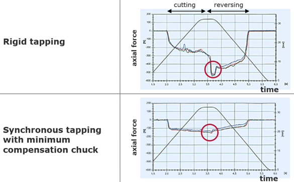 When reversing, the tool is stopped for a short amount of time. If materials with spring-back effect are being machined, it can happen that the tool gets jammed from the tapped hole closing up after the cutting is complete.