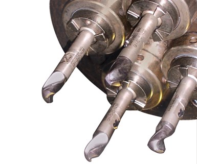 Another common waste of production time was the need to change broken inserts. The solid carbide of the Vex-S’s drill tip lasts longer, and replacement enables the shop to swap blades without using tools or presetting between drill changes. With adequate coolant, Mr. Boles estimates the Vex-S can go for over a month without having to change inserts.