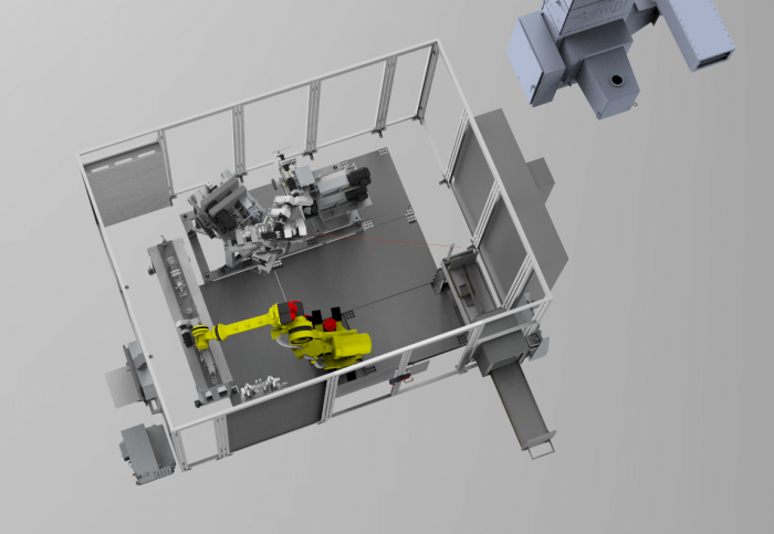 Guests get a good look at the Felsomat laser welder, looking over the twin entry/exit conveyors for RDU and PTU parts. The Fanuc robot loads the laser cleaned and pressed part into the Felsomat laser welder with Trumpf 6kW laser