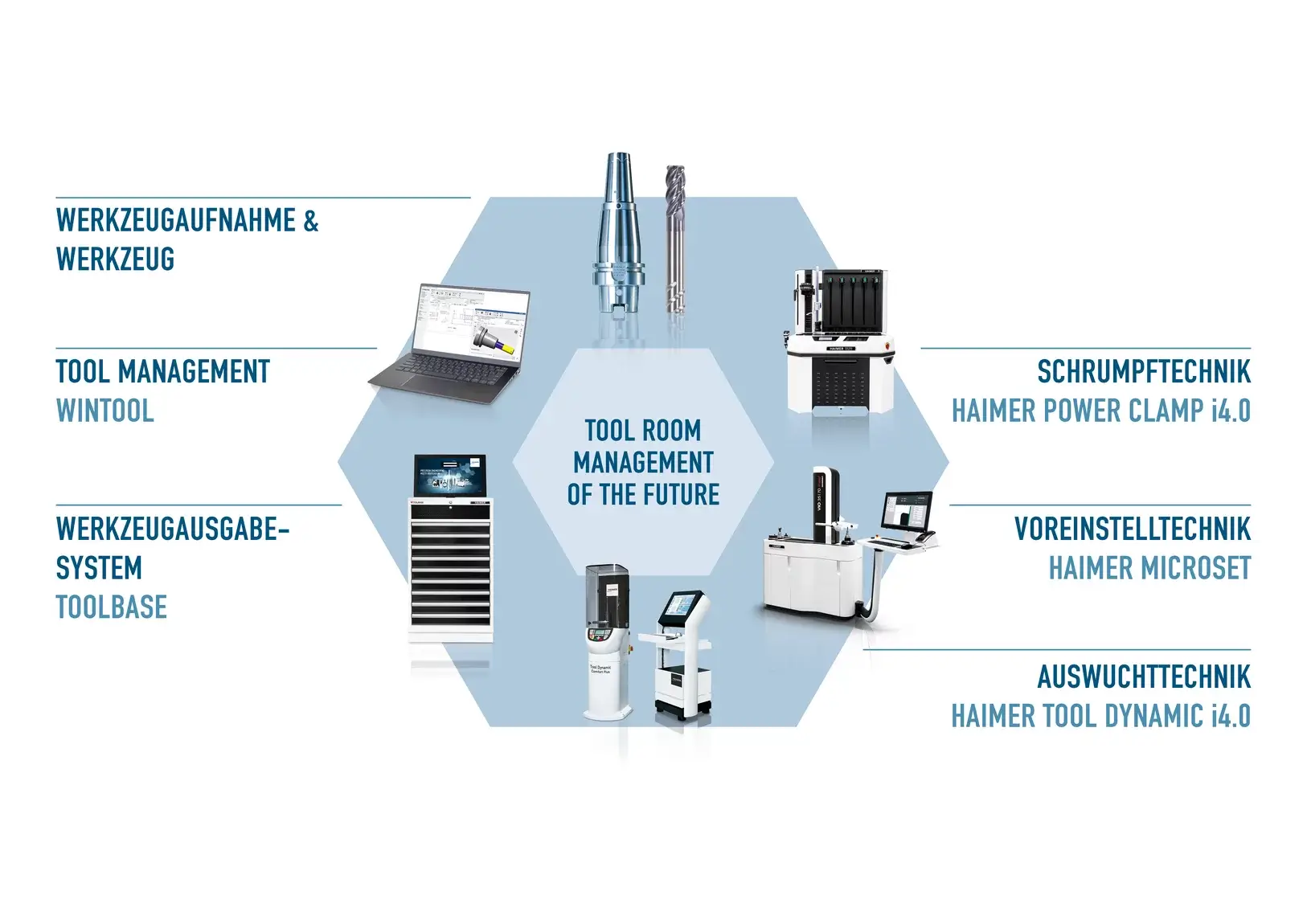 Starting from the HAIMER tool holders and tools as well as the Toolbase dispensers, the 3D data is managed digitally by the WinTool software, right through to dispatch to the machine tool control. The connected HAIMER Power Clamp, Tool Dynamic and Microset machines are available for the analog setup process.