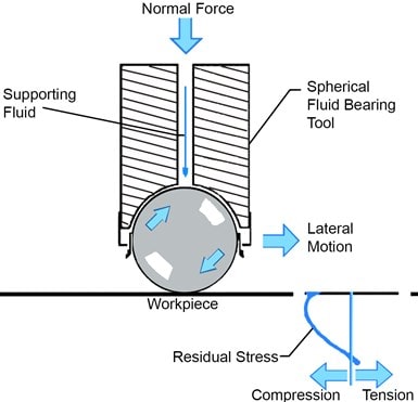 This diagram shows the hydrostatic roller-burnishing tool. This control enables the company to apply just enough pressure to just exceed the yield point at which the material deforms plastically.