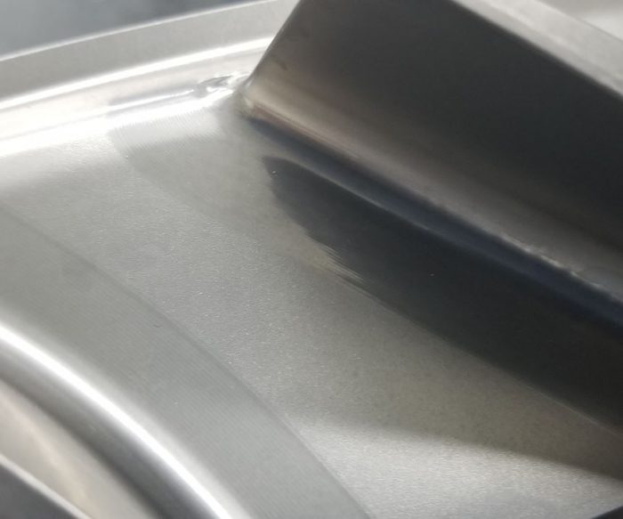 Low-plasticity burnishing is a finishing process developed by Lambda Technologies that strengthens a part at specific areas while minimizing the effect on the finish. In this example, the company strengthened the base of the turbine blades, which you can see in the shinier finish.