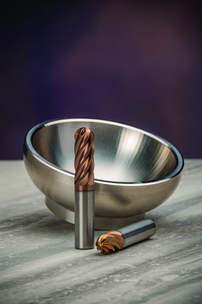 AMAZING LONG-LIFE TOOL Machining this Inconel 718 deflector bowl would take much longer with 4-flute mills. But the POW-R-ARC 8-flute did the 3D roughing and semi-finishing in 50 min. at 31 ipm. The same tool completed the finishing at 60.5 ipm and chamfering the rim in just 22 min. total cycle time. And it still has plenty of tool life!