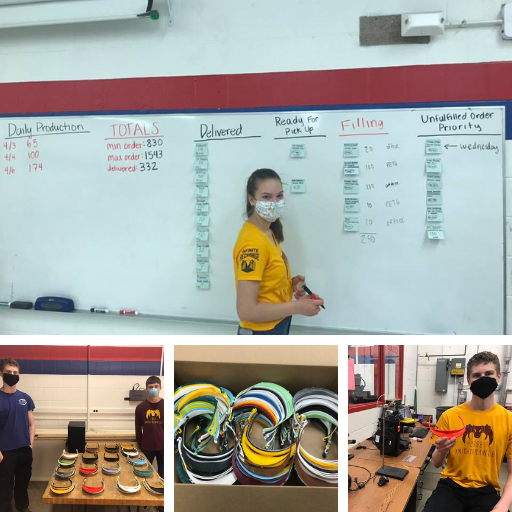 “The FIRST Robotics competition was canceled mid-season due to COVID-19. Since schools were also canceled, we knew there were 20+ printers just sitting at the schools collecting dust. We saw an opportunity. We were able to collect all of the printers from four schools in the district and start manufacturing face shields. We have 23 printers running 10 hours a day, 6 days a week, to print 200 face shields per day. Laser cutters are being used to cut petg sheets for the face shield until we ran out of petg due to the current shortage. High school students are both operating the machines and distributing the completed shields to local medical workers, law enforcement, elderly care staff, and dentists.”