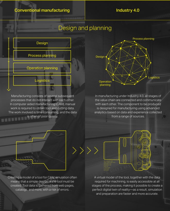 Industry 4.0 has already started to transform manufacturing. Digital technology connects all stages of the value chain, enabling communication between the various parts of a process. For instance, during the initial planning stages of component production, engineers can take into consideration advanced analytics from a recent project (i.e. run and tooling data) to inform their plans.