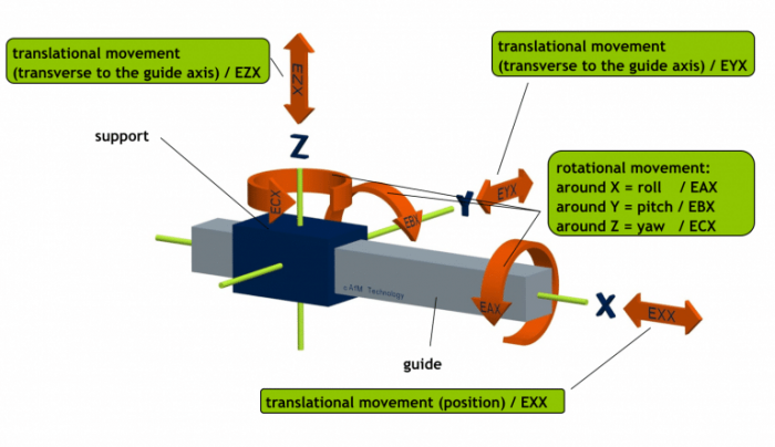 Three translational and three rotational movements comprise the six degrees of freedom of a single linear axis (in this case X). A typical five-axis machine has 43 possible deviations, not counting the spindle. (Provided by SIOS Messtechnik)