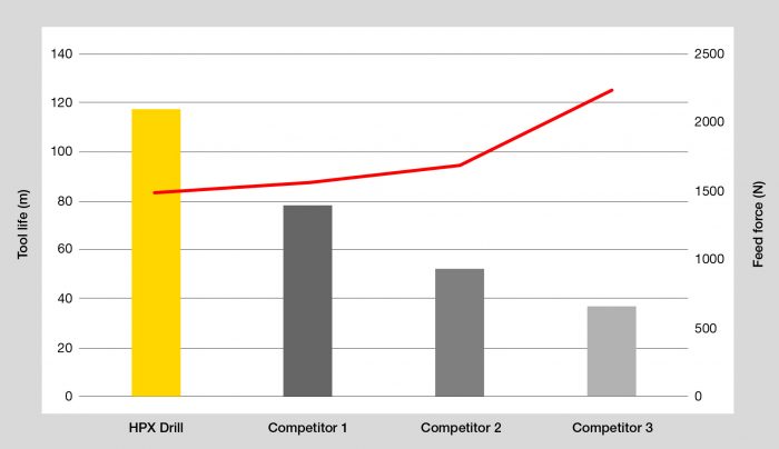 The HPX drill can run very high cutting parameters,” says Product Manager Frank Martin. “It lasts longer, generates lower forces, and makes better quality holes. What more can you ask for in a drill?”