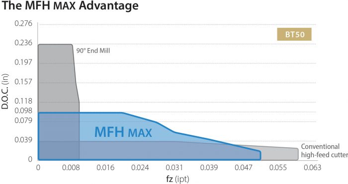 After the previous success of the MFH-RAPTOR, MFH-Mini, and MFH-Micro, Kyocera’s introduction of the MFH-MAX provides a new alternative to conventional 90° end mills
