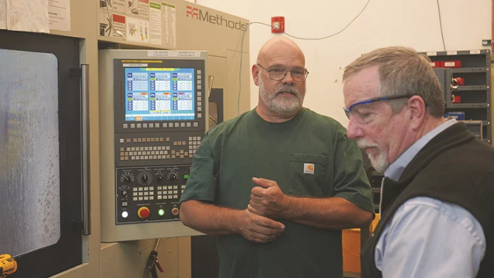 Greg Camron (left), shop manager at Alicat Scientific, and Bernie Otto, Kiwa product manager for Methods Machine Tools, going over the Kiwa KHM-300A PC6.