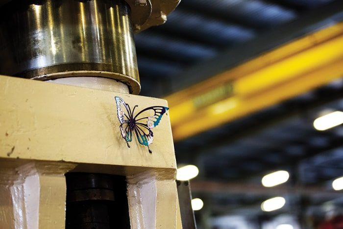 Walk into the expanse of the H&S plant and you might see a massive pressure vessel in one area, a piping skid in another area, plate rolling and plasma cutting in action, and heavy machinery galore. Perched on the side of many of those machines is a delicate butterfly, laser-cut from thin sheet metal and intricately painted.