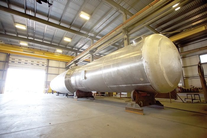A large vessel nears completion, staged in one “lane” on H&S’s shop floor.