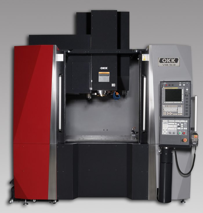 The new OKK VMC features a 20,000 RPM, 20/15 HP spindle and has X,Y,Z travels of 41.3″ x 20.8″ x 20.1″ (1,050 mm x 530 mm x 510 mm), respectively. The automatic tool changer will store up to 30 tools. The table work surface area is 49.6″ x 23.6″ (1,260 mm x 600 mm), and offers load capacity of 2,646 lbs (1,200 kg). The OKK VB53a is a compact size machine with a footprint of 98.23″ (2,495 mm) x 120″ (3,050 mm) for economical use of floor space.
