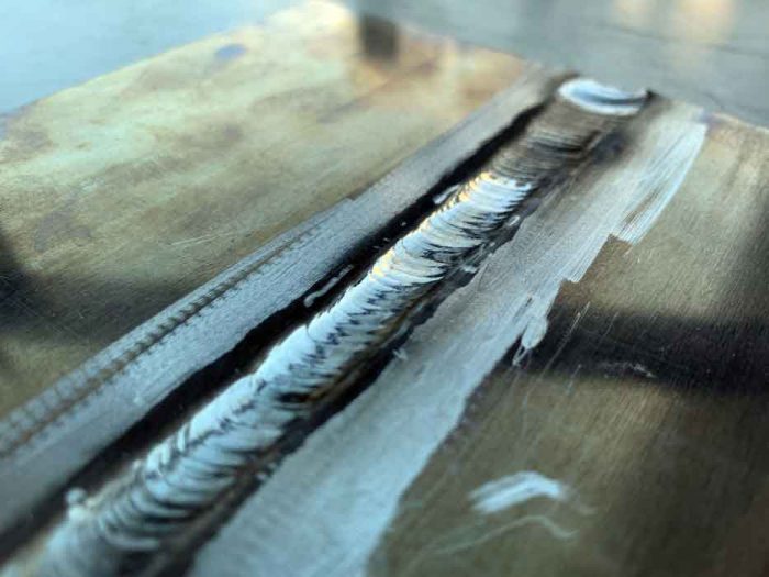 Two pieces of aluminum 7075 are welded together with a nanoparticle-infused filler wire. Photo courtesy of Oszie Tarula, UCLA.