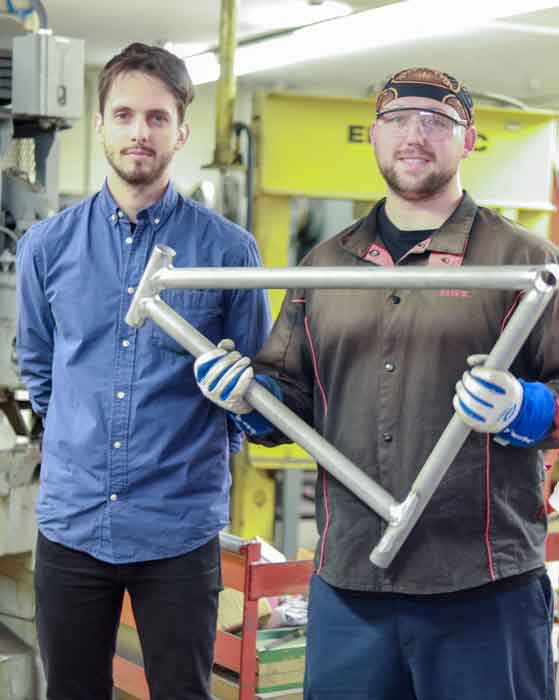 UCLA Samueli School of Engineering lab technician Travis Widick holds a bike frame welded using aluminum alloy 7075 with graduate student Maximilian Sokoluk. Photo courtesy of Oszie Tarula, UCLA.