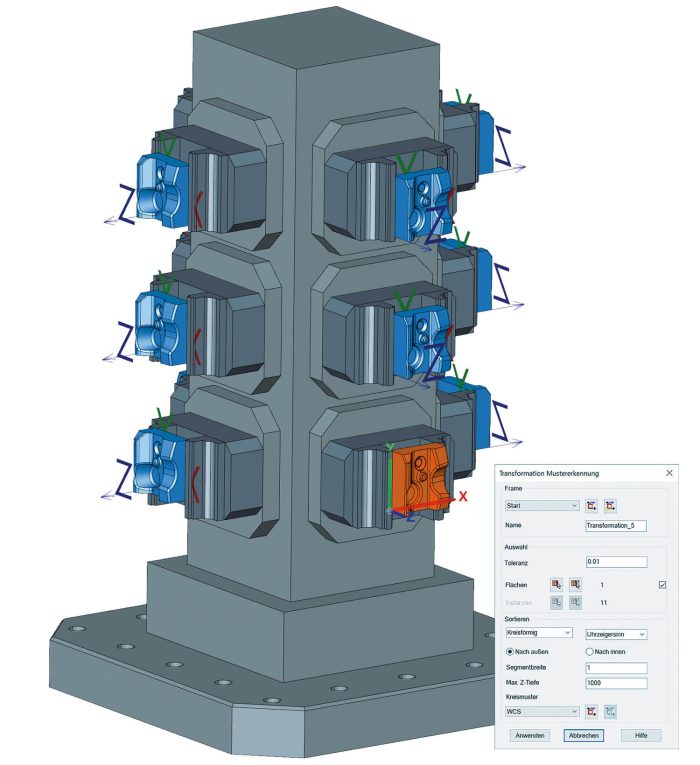 For easy programming of recurring shapes with a single click, hyperMILL® 2023 has a new General Transformation Pattern feature. The new feature uses a selected reference geometry and searches for the same reference in all other models regardless of its spatial orientation, creating a general transformation pattern including associated frames. This is highly useful when there are multiple components.