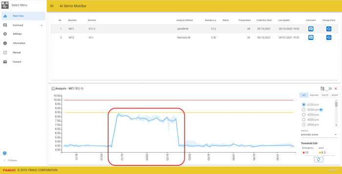 AI Servo Monitor, in conjunction with MT-LINKi through machine learning, analyzes the daily performance of machines equipped with FANUC CNCs. Daily data is displayed in intuitive graphs which allows users to easily monitor abnormalities on these machines. Artificial intelligence automatically creates a baseline model of the machine while running in a normal state. An “anomaly score” developed expresses a difference in the baseline model and the daily recorded values. On a web interface, users can easily see the anomaly scores in a graph. Plus, email notifications can be issued if this value exceeds the predefined thresholds.