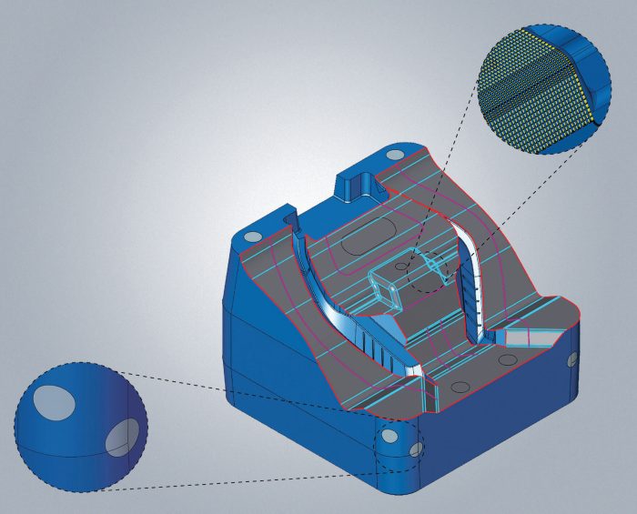 Once the data is organized, the CAM workflow can be processed with more intelligence and higher efficiency. The first benefit from hyperMILL® CAM Plan is that component topology is analyzed to produce a precise toolpath that has command locations aligned with key geometric features and with optimized point distribution for milling. The result is improved surface finishes, easier processing by NC controllers, and reduced machining times.