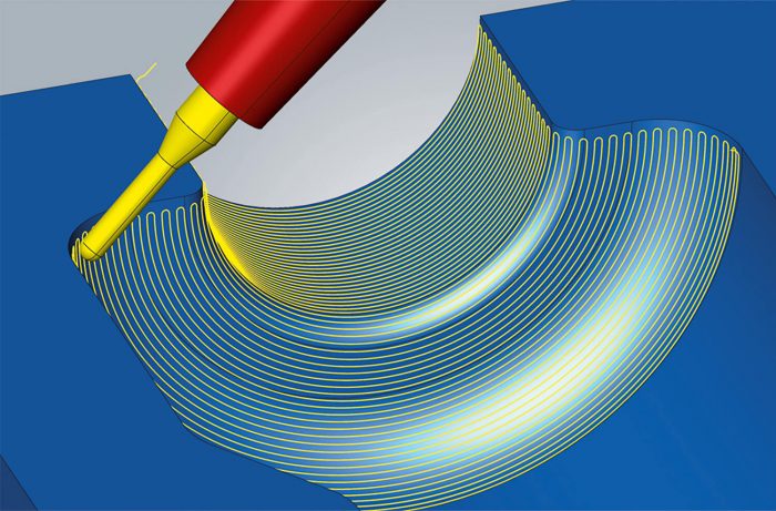 Five-axis radial machining strategy for blow molds has been enhanced to better handle steep areas and undercut regions, and to adapt to 3-axis machines as required. For 5-axis Tube Finishing, there have been several enhancements to improve machining quality and simplify programming.