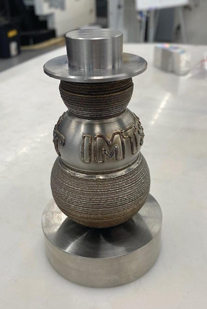 Snowman figurine built in a single hyperMILL® training session by Alan Buri, PhD Candidate at Georgia Tech. This figurine combines additive manufacturing, turning and blending techniques to create the hollow spheres, with subtractive machining to create the hat and base
