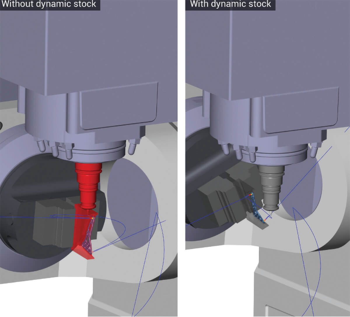 Linking movements via hyperMILL® VIRTUAL Machining Optimizer have been further optimized for actual stock conditions with new Dynamic Stock technology. Using Dynamic Stock, an updated stock is automatically generated for all machining jobs and accounted for when calculating linking movements.