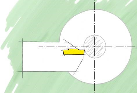 When parting off a component with a pre-machined hole, the cylindrical part of the hole must be deeper than the position of the complete grooving tool. As shown in the diagram below, if the parting off tool crosses the taper of the pre-drilled hole, it will leave a very nasty and unplanned burr at the base of the finished component. The parting off insert should be planned to completely go past the contour left by the point angle of a solid drill or insert contour of an indexable drill.