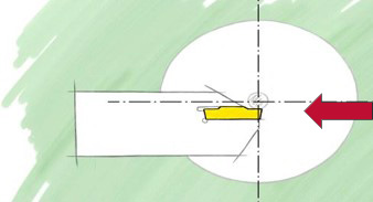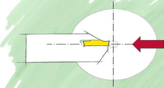 The deflection induced goes up as a cube of the distance from the chuck. So, if insert moves 2 x diameter away from the chuck, the deflection would actually go up by a cube, meaning 8 times the current deflection. In order to keep the insert as close to the chuck as possible, attention should be paid to the selection of holder as well. Just the change of selection from the right hand holder to the left hand holder can make a significant difference in the distance of the insert from the chuck, as shown in the diagram below.