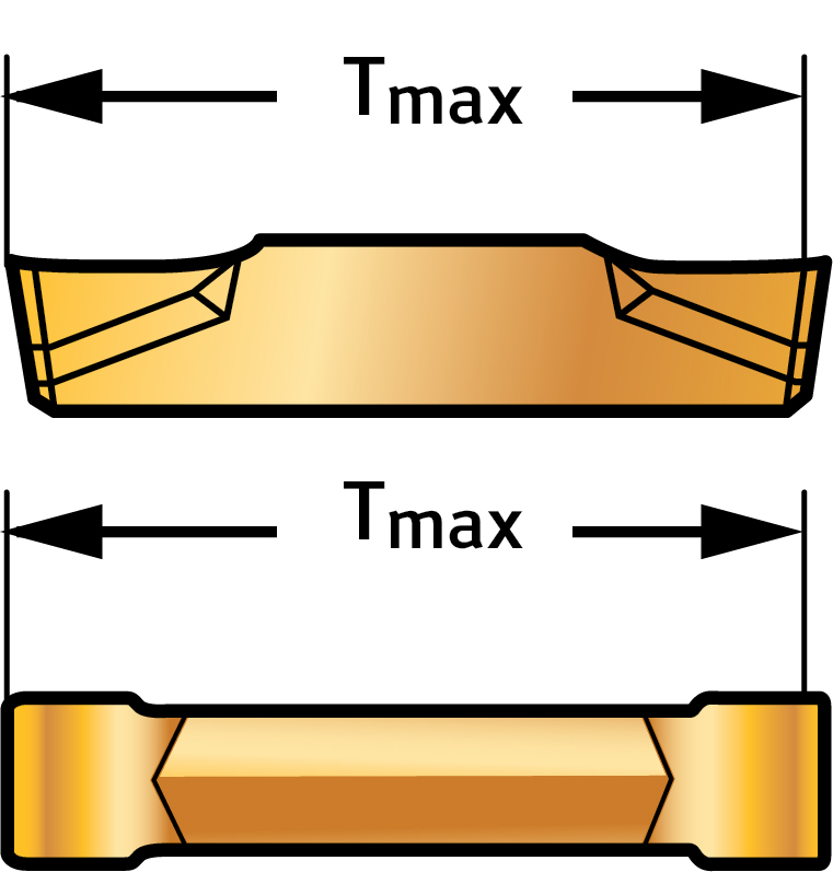 If the maximum cutting depth does not exceed the second cutting edge, then the ‘double sided’ inserts, such as the GX inserts, are the first choice. Typically, these inserts have a wider and more stable base than the corresponding single sided inserts. The double-sided inserts have better clamping force in the tool holders and with two cutting edges per insert, they also tend to be more cost effective in the long run. However, as mentioned earlier, it is important to check the maximum cutting depth as a function of total insert length. As shown in the images below, if the part off depth “Tmax” is such that the back end of the dog-bone style insert hits the workpiece, then this can cause violent insert failure and damage to the tools. Thus, the double-sided inserts are always limited to a depth less than the total length of the insert. Although there are some other options, such as single-sided dog-bone inserts, twist style double-sided inserts or simply longer inserts with higher Tmax number, single sided inserts are generally the first choice for deeper depth beyond 1.34” (34mm).