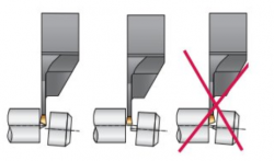One option of guiding the shape of the chip while using an inclined insert, is to interrupt the operation after a depth of 1 or 2 x width [S] is reached. Once the operation resumes, the new chip then flows within the formed groove. This method, however, still risks damaging the shoulder of the finished workpiece with the helical chips.