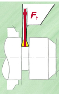 Another application to consider when using inclined cutting edge is the tendency of the tool to ‘walk’ or run off-center with the feed force. With a neutral insert, the feed forces Ff are in the direction of the feed.