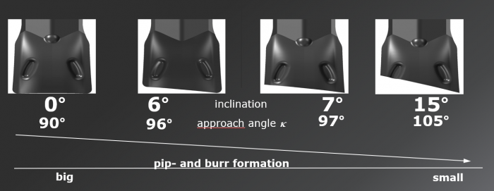 It is important to note that the benefits and adverse effects both increase as the inclination angle increases. So, a neutral cutting edge will have the largest burr, but the least tendency to ‘walk’, because the additional component of force (Fp) is missing. As the inclination angle increases, the burr formation reduces, but the tendency to ‘walk’ increases steadily. So, additional care should be exercised when using inserts with aggressive inclination angles. Below are the typical inclination angles seen in the market and corresponding effect on burr or pip formation.