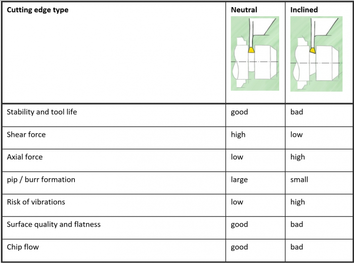 From all of the above discussion, it is clear the inclined or handed inserts should be used only to trouble shoot in certain applications. Below is the summary of applications considerations between neutral and inclined cutting edges.