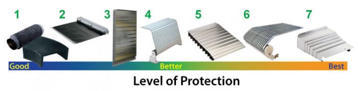 3. Steel Sliding Plate Covers provide a low-profile option capable of high-speed operation and will endure weld spatter and hot chips. Liquids may seep through shields, so let the manufacturer know what type of conditions are expected.