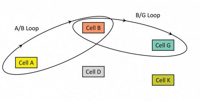 Figure 3 The arrows in this chart detail the direction of flow—from Cell A to B to G, while the bottom of the loop (with no arrows) signifies the return trip of capacity control cards. These loops overlap at Cell B.