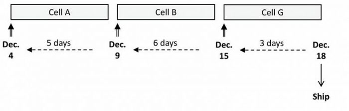 Figure 4 Scheduling determines authorization dates based on available data from an ERP or other scheduling system. Here, each cell has several workcenter operations that add up to a certain number of days. Authorization dates can be fine-tuned over time.