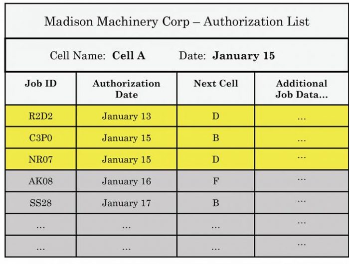 The authorization list in Figure 5 shows a job on the schedule for Cell A and the next cell. It’s Jan. 15, and you see material has arrived for the job R2D2. Its authorization date, Jan. 13, is in the past, so you know it’s authorized to run. The job is destined for Cell D, so the POLCA board needs an A/D card. If you see it, you grab it, attach it to the job packet, and start the job.