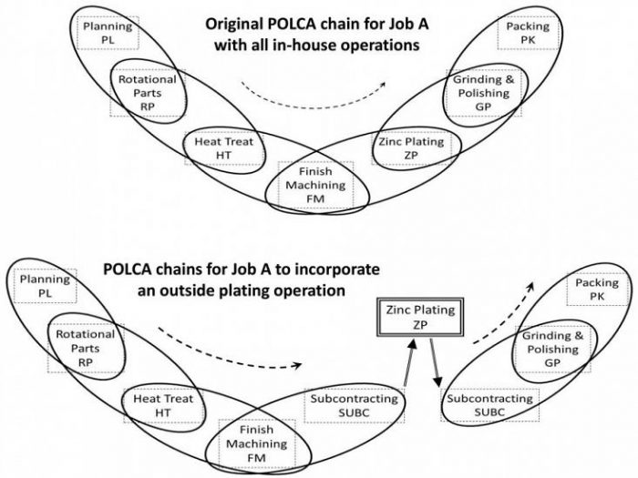 Figure 6 shows a job that has most operations in-house except for zinc plating. Suri recommends that jobs requiring outside services flow through two POLCA chains. One starts with planning and ends with the subcontracting planning team (which could be the same as the initial planning team). The subcontracting team then acts as the beginning of a second chain. When it sends a job out for zinc plating, it sends a POLCA card (in this case, an FM/SUBC card) back to the finish machining cell. When the job comes back in a few days, the team releases the job into the second POLCA chain.