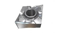 Crane said the ECA-H4-CF has a similar core diameter and flute chip gullet section size as the three-flute design and is chatter free at up to 33,000 rpm, and that extra flute delivers faster material removal. For turning, Iscar offers a new insert called ALUPTURN. That’s “alu” for the application (aluminum), “p” for the positive rake, and of course “turn” for the process. Crane explained that the industry standard has always been a ground sharp single-sided insert, while the “ALUPTURN looks like two CCGTs back to back. This means four cutting edges for approximately the same price as the two-cutting-edge CCGT insert without sacrificing any of the performance. That’s tough to do with an insert for aluminum because you need to be very aggressive with the chip breakers.” The ALUPTURN is designated as either a CNGG or CNGX form and is designed mainly for machining aluminum wheels.